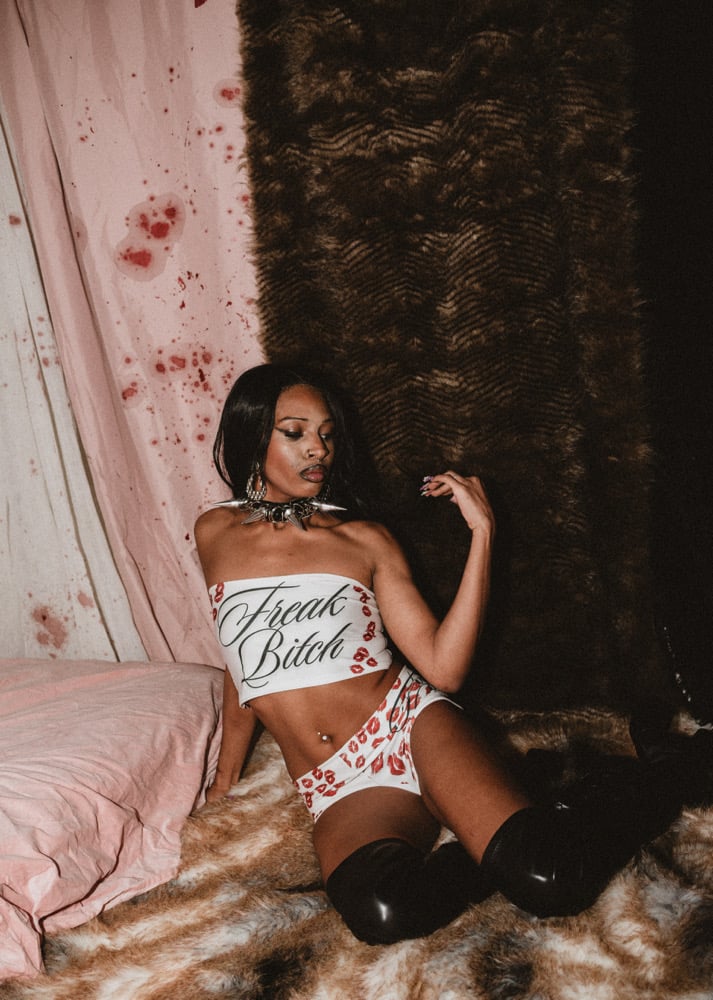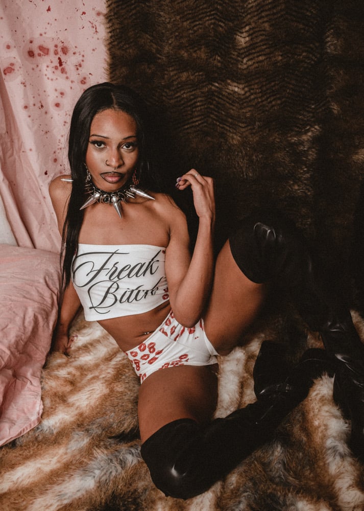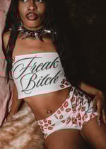 Two piece micro shorts + tube top set with “freak bitch” in cursive + kiss marks! Words are customizable.